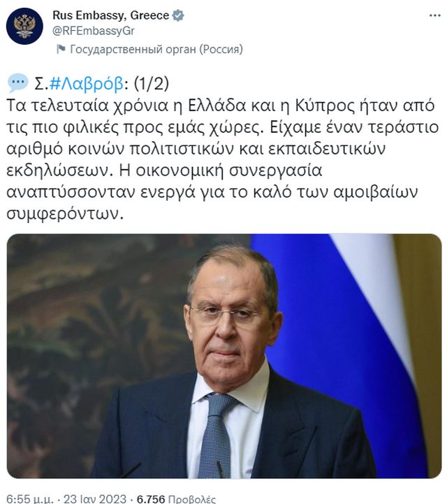 Η ρωσική πρεσβεία δημοσιεύει δήλωση του Ρώσου υπουργού Εξωτερικών, Σεργκέι Λαβρόφ, ο οποίος αναφέρεται στη στάση της Αθήνας και της Λευκωσίας απέναντι στη Ρωσία μετά την εισβολή στην Ουκρανία και ιδιαίτερα στο θέμα των κυρώσεων.