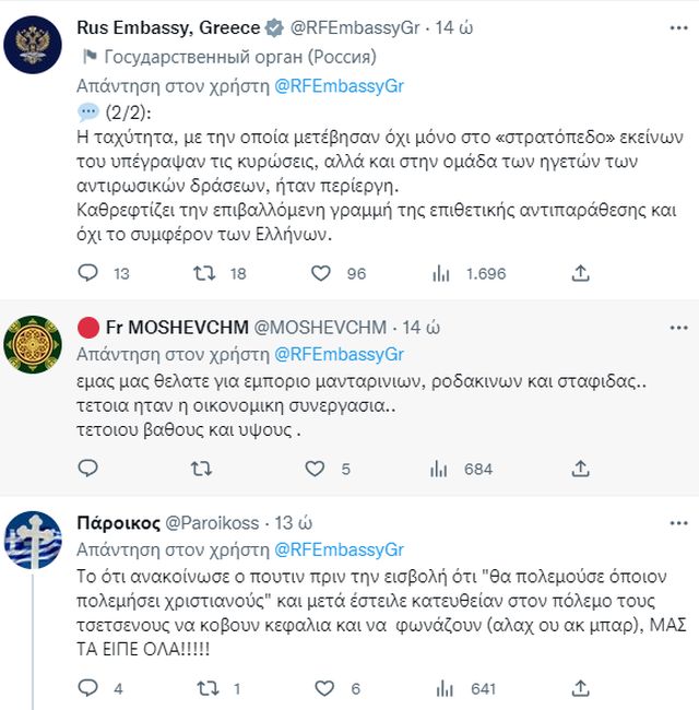Πολλά ερωτήματα έχει προκαλέσει η ανάρτηση της ρωσικής πρεσβείας στην Αθήνα, στον επίσημο λογαριασμό της στο Twitter, με αιχμές εναντίον της Ελλάδας και της Κύπρου.