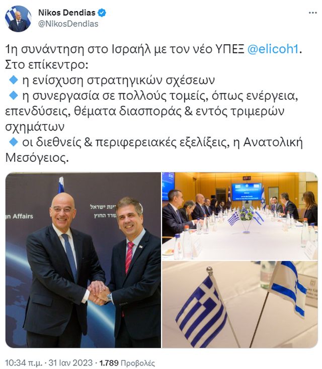Το μήνυμα πως το Ισραήλ υποστηρίζει τα κυριαρχικά δικαιώματα και την εδαφική ακεραιότητα της Ελλάδας έστειλε ο υπουργός Εξωτερικών του Ισραήλ, Έλι Κοέν, σε δηλώσεις του μετά τη συνάντησή του με τον Έλληνα υπουργό Εξωτερικών, Νίκο Δένδια, που πραγματοποιήθηκε στα Ιεροσόλυμα.
