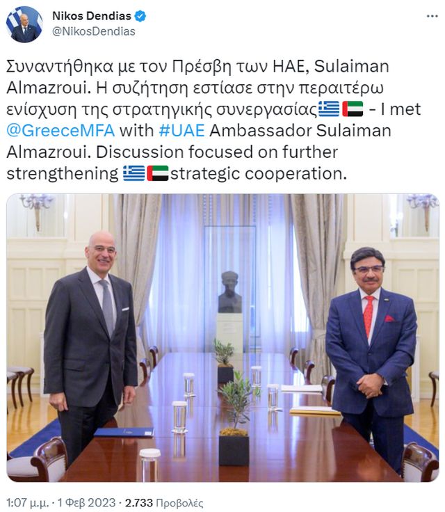 Συνάντηση με τον πρέσβη των Ηνωμένων Αραβικών Εμιράτων, Σουλεϊμάν Αλμαζρούεϊ (Sulaiman Almazroui), πραγματοποίησε ο υπουργός Εξωτερικών, Νίκος Δένδιας, την Τετάρτη (1/2).