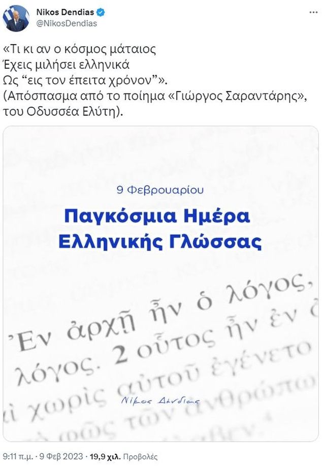 Ανάρτηση στο Twitter για την Παγκόσμια Ημέρα Ελληνικής Γλώσσας έκανε κι ο υπουργός Εξωτερικών, Νίκος Δένδιας, ο οποίος έγραψε: