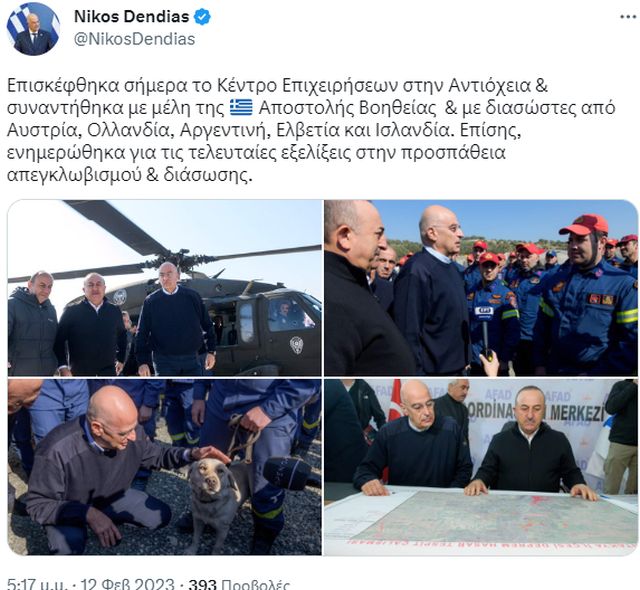 Την Κυριακή ο Νίκος Δένδιας επισκέφθηκε την Τουρκία και ιδιαίτερα την Αντιόχεια. Ο Έλληνας υπουργός Εξωτερικών μετέφερε τον Τούρκο ομόλογό του, Μεβλούτ Τσαβούσογλου, τα ειλικρινή συλλυπητήρια της Κυβέρνησης και του λαού της Ελλάδας για τις χιλιάδες απώλειες συνανθρώπων μας στην Τουρκία, όπως και την υπερηφάνεια του για τους Έλληνες διασώστες.
