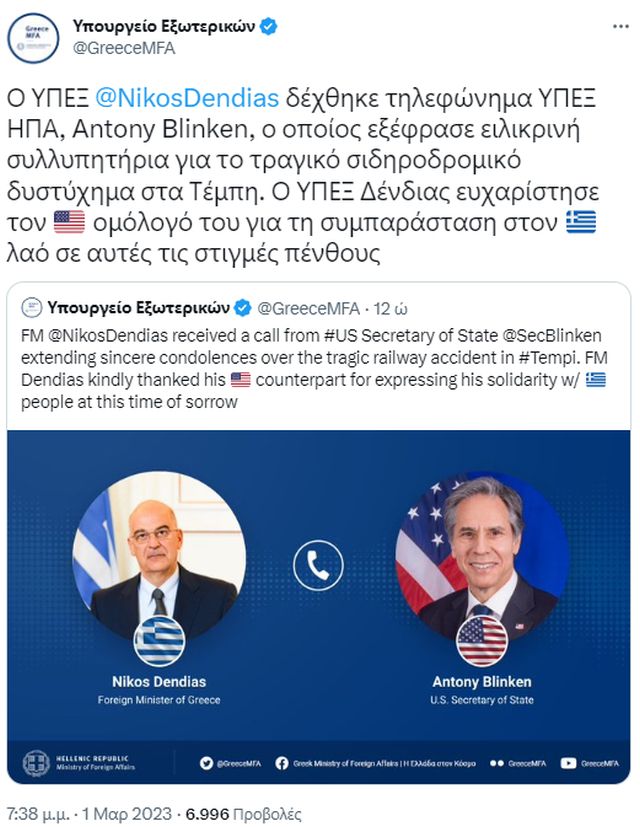 Σύμφωνα με ανακοίνωση του ελληνικού υπουργείου Εξωτερικών, ο Αμερικανός ΥΠΕΞ εξέφρασε ειλικρινή συλλυπητήρια για το τραγικό σιδηροδρομικό δυστύχημα στα Τέμπη.