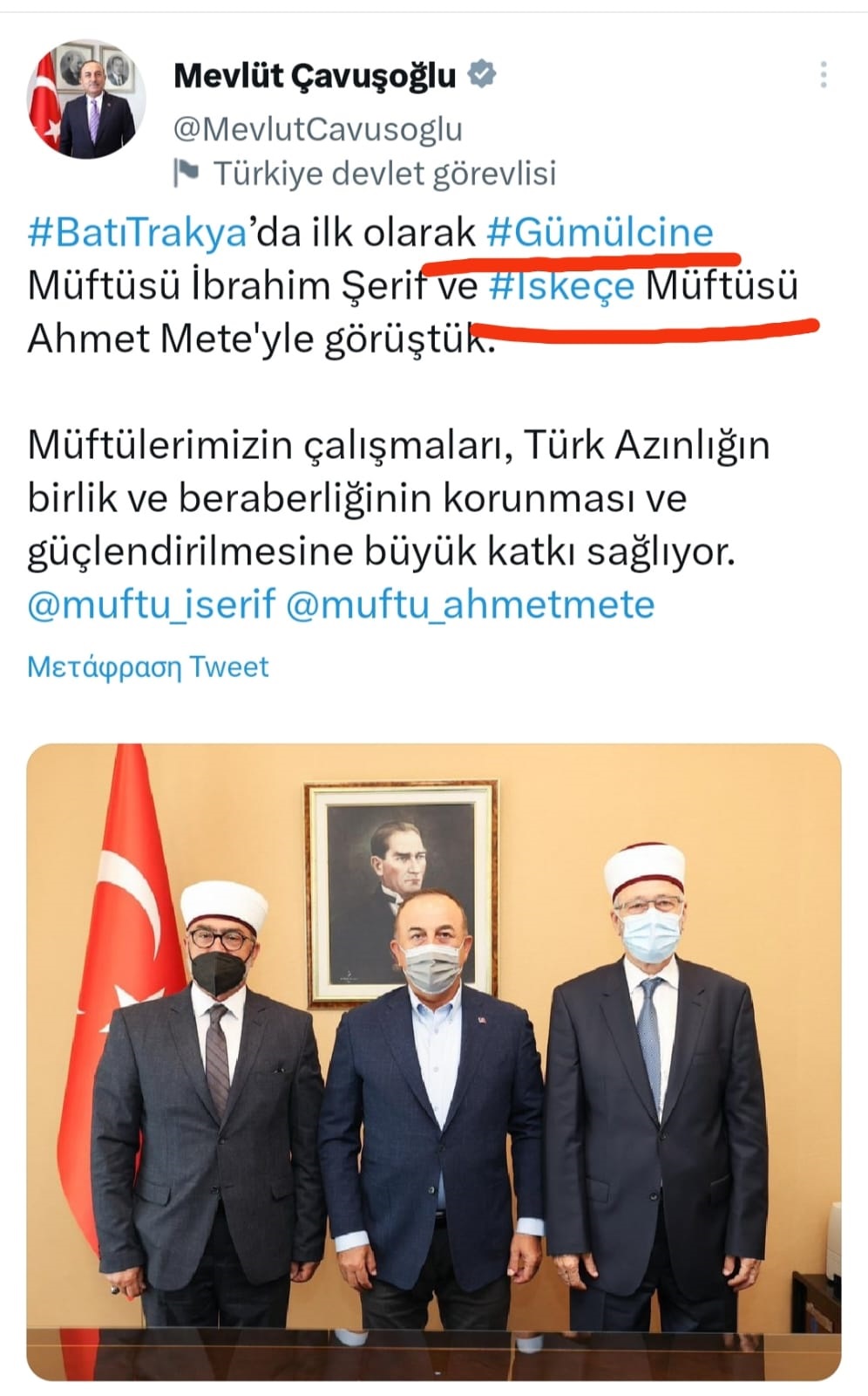 Για παράδειγμα, ο Τσαβούσογλου, όπως μπορείτε να δείτε παρακάτω, έχει γράψει σε ανάρτησή του «Gümülcine» την Κομοτηνή και «İskeçe» την Ξάνθη.