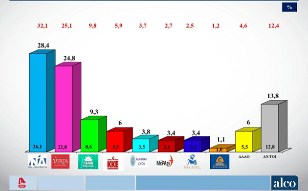Στο όριο του στατιστικού λάθους έχει διαμορφωθεί η διαφορά μεταξύ της ΝΔ και του ΣΥΡΙΖΑ σύμφωνα με τη δημοσκόπηση της Αlco για λογαριασμό του τηλεοπτικού σταθμού Alpha και συγκεκριμένα μόλις στις 3,6 μονάδες.