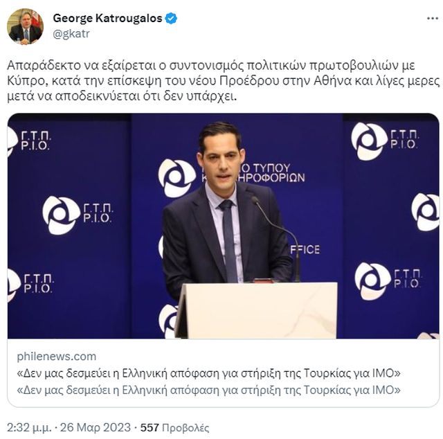 Κριτική προς το Μαξίμου ασκεί με ανάρτησή του στο Twitter ο Τομεάρχης Εξωτερικών του ΣΥΡΙΖΑ-ΠΣ, Γιώργος Κατρούγκαλος, με αφορμή την απόφαση της κυβέρνησης να στηρίξει την τουρκική υποψηφιότητα για τη Γενική Γραμματεία του Διεθνούς Ναυτιλιακού Οργανισμού, γεγονός που προκάλεσε και την αντίδραση της κυπριακής πλευράς.