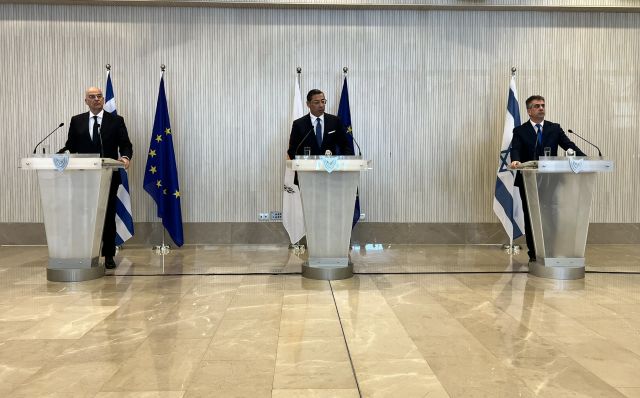 Στη συνάντηση συμμετείχε ο υπουργός Εξωτερικών, Νίκος Δένδιας και οι ομόλογοί του από την Κύπρο και το Ισραήλ, Kωνσταντίνος Κόμπος και Έλι Κοέν (Eli Cohen), αντίστοιχα.