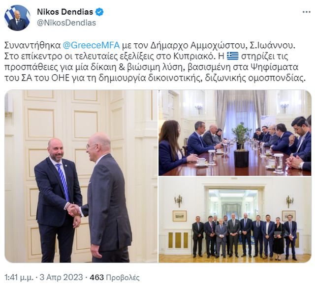 Αφοσιωμένος φίλος της αλήθειας και της δικαιοσύνης και σθεναρός σύμμαχος του κυπριακού Ελληνισμού ο Νίκος Δένδιας, συναντήθηκε τη Δευτέρα 3 Απριλίου 2023 στο υπουργείο Εξωτερικών με τον δήμαρχο της κατεχόμενης Αμμοχώστου.