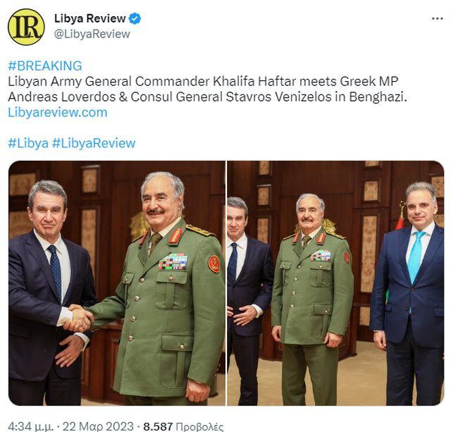 Τον περασμένο μήνα, η Πρόεδρος της Βουλής της Λιβύης, Ακίλα Σαλέχ συναντήθηκε με τον βουλευτή των Ελλήνων, Ανδρέα Λοβέρδο, στη Βεγγάζη.