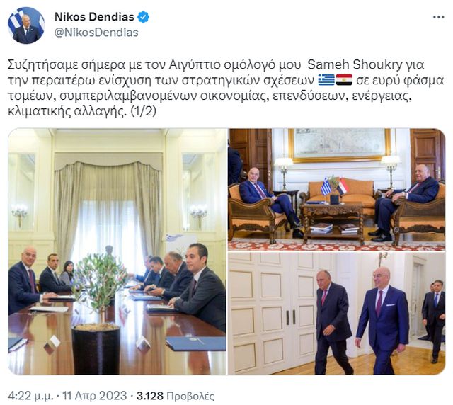Επίσης, σημείωσε πως η στενή και διαρκής συνεργασία Αθηνών και Καίρου αποφέρει πολλά θετικά αποτελέσματα για την αποφυγή εντάσεων και κρίσεων στην περιοχή μας.