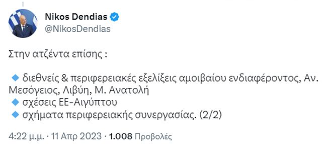 Υπό αυτό το πρίσμα, κατά τη συνάντηση με τον Αιγύπτιο ομόλογό του, ο Νίκος Δένδιας τον ενημέρωσε για τις τελευταίες εξελίξεις στις ελληνοτουρκικές σχέσεις, για το κλίμα που επικρατεί μετά τους καταστροφικούς σεισμούς και μετά την επίσκεψή του στην Αντιόχεια.