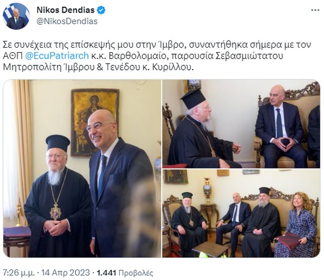 Από την πλευρά του ο Οικουμενικός Πατριάρχης εξέφρασε την ευγνωμοσύνη του για την επίσκεψη του κ. Δένδια στην Ίμβρο.