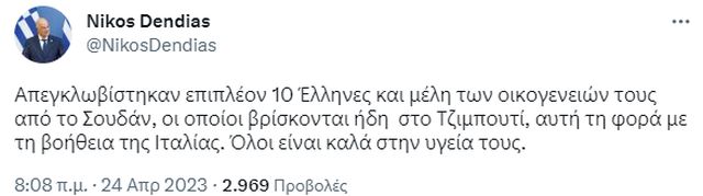 «Απεγκλωβίστηκαν επιπλέον 10 Έλληνες και μέλη των οικογενειών τους από το Σουδάν, οι οποίοι βρίσκονται ήδη στο Τζιμπουτί, αυτή τη φορά με τη βοήθεια της Ιταλίας.