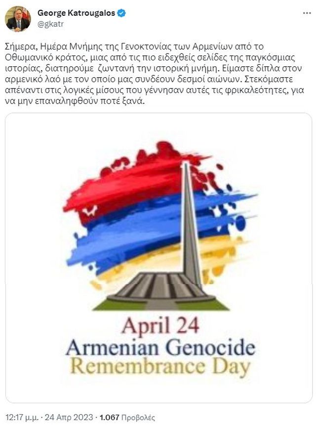 Ανάρτηση για την ημέρα μνήμης της Γενοκτονίας των Αρμενίων έκανε ο Γιώργος Κατρούγκαλος στο Twitter. Ο βουλευτής του ΣΥΡΙΖΑ Προοδευτική Συμμαχία και πρώην υπουργός Εξωτερικών έγραψε: