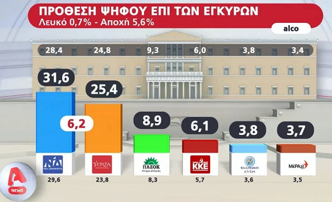 Με 6,2 μονάδες στην πρόθεση ψήφου επί των εγκύρων (5,8 μονάδες στην πρόθεση ψήφου με όλες τις απαντήσεις) προηγείται η Νέα Δημοκρατία του ΣΥΡΙΖΑ σύμφωνα με την νέα δημοσκόπηση της Alco και παρουσιάστηκε στον τηλεοπτικό σταθμό Alpha.