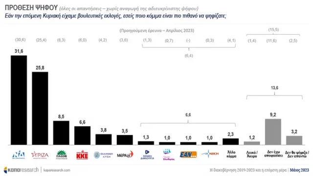Παράλληλα, «Δεν έχω αποφασίσει» δηλώνει το 9,2% ενώ τέσσερα κόμματα (Εθνική Δημιουργία, Πλεύση Ελευθερίας, ΕΑΝ και Νίκη) καταγράφουν ποσοστό από 1 έως 1,3%.
