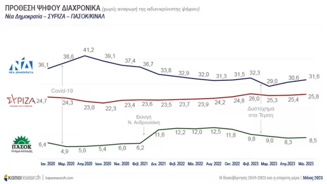 Το χαμηλότερο σημείο μοιάζει να είναι τον Μάρτιο του 2023, ακριβώς μετά το πολύνεκρο δυστύχημα στα Τέμπη, όπου τα δύο κόμματα μετριούνται στο 29% η ΝΔ και στο 25,3% ο ΣΥΡΙΖΑ, δηλαδή με διαφορά στις 3,7 ποσοστιαίες μονάδες.