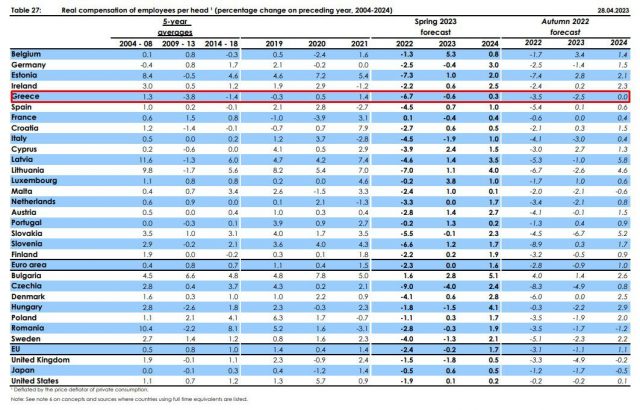 Συγκεκριμένα στις εαρινές προβλέψεις της Ευρωπαϊκής Επιτροπής που δημοσιεύθηκαν στις 15 Μαΐου, καταγράφεται μεταξύ άλλων και η λίστα με τον πραγματικό μισθό ανάμεσα στις χώρες της ΕΕ, με την Ελλάδα να βρίσκεται χαμηλά στην κατάταξη, σημειώνοντας μείωση 6,7% στον πραγματικό μισθό για την άνοιξη 2022. Ο μέσος όρος για τις χώρες της ΕΕ ήταν –2,3%.