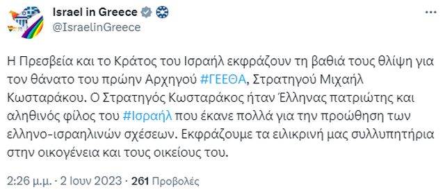 Το Ισραήλ, μέσω της Πρεσβείας του στην Αθήνα, εξέφρασε τη βαθιά του θλίψη για τον θάνατο του στρατηγού Κωσταράκου. Σε ανάρτησή της στο Twitter η ισραηλινή Πρεσβεία έγραψε: