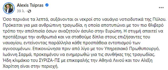 Σε ανάρτηση που έκανε στο Facebook, o Αλέξης Τσίπρας γράφει: