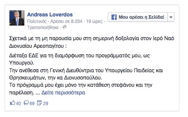Με ανακοίνωσή του ο κ. Λοβέρδος σχετικά με τη μη παρουσία του στη δοξολογία αναφέρει ότι διέταξε ΕΔΕ για τη διαμόρφωση του προγράμματός του, ως υπουργού.