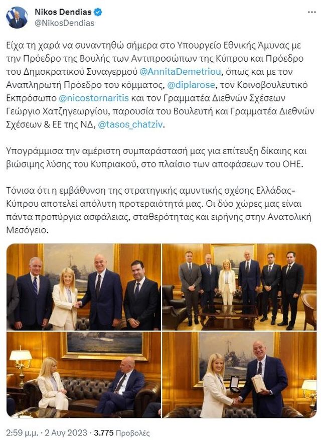 «Είχα τη χαρά να συναντηθώ σήμερα στο Υπουργείο Εθνικής Άμυνας με την Πρόεδρο της Βουλής των Αντιπροσώπων της Κύπρου και Πρόεδρο του Δημοκρατικού Συναγερμού @AnnitaDemetriou, όπως και με τον Αναπληρωτή Πρόεδρο του κόμματος, @diplarose, τον Κοινοβουλευτικό Εκπρόσωπο @nicostornaritis και τον Γραμματέα Διεθνών Σχέσεων Γεώργιο Χατζηγεωργίου, παρουσία του Βουλευτή και Γραμματέα Διεθνών Σχέσεων & ΕΕ της ΝΔ, @tasos_chatziv.