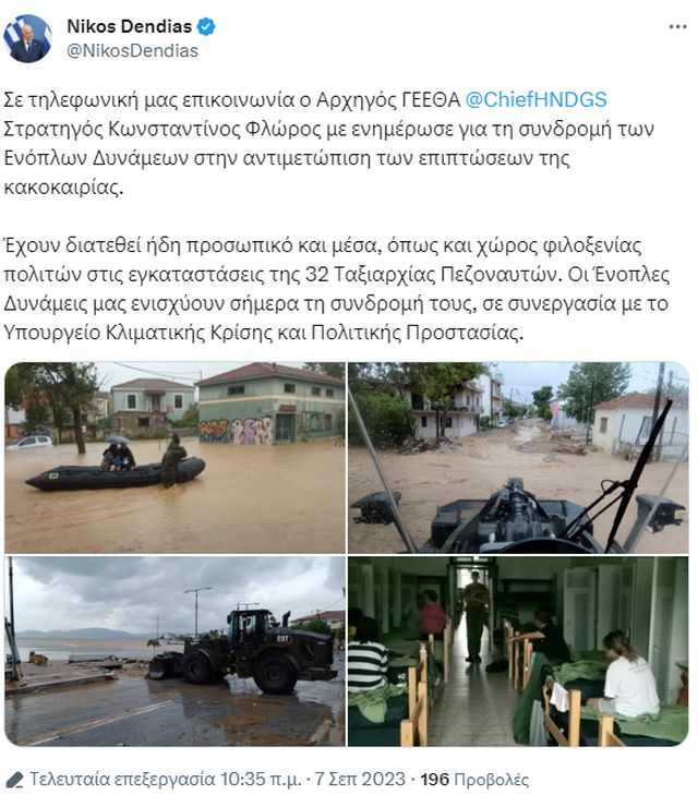 «Σε τηλεφωνική μας επικοινωνία ο Αρχηγός ΓΕΕΘΑ, Στρατηγός Κωνσταντίνος Φλώρος, με ενημέρωσε για τη συνδρομή των Ενόπλων Δυνάμεων στην αντιμετώπιση των επιπτώσεων της κακοκαιρίας», έγραψε ο Νίκος Δένδιας στο «Χ», πρώην Twitter, το πρωί της Πέμπτης 7/9 και συνέχισε: