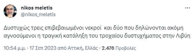 «Δυστυχώς τρεις επιβεβαιωμένοι νεκροί και δύο που δηλώνονται ακόμη αγνοούμενοι η τραγική κατάληξη του τροχαίου δυστυχήματος στην Λιβύη», έγραψε ο διπλωματικός συντάκτης Νίκος Μελέτης στο «Χ», πρώην Twitter.