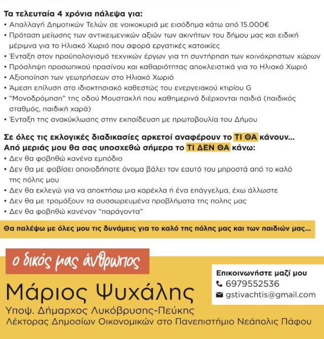 »Με έκανε όμως να συνεργαστώ στενά με τον Μάριο Ψυχάλη και να δω τον τρόπο που δουλεύει, παλεύει και αναζητά τους καλύτερους και πιο αποτελεσματικούς τρόπους για να βελτιώσει την πόλη μας.