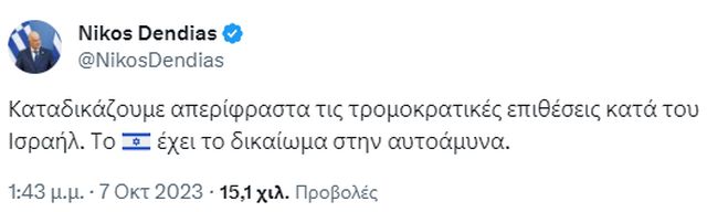 Καθαρή θέση υπέρ του Ισραήλ πήρε ο Νίκος Δένδιας. Ο υπουργός Άμυνας της Ελληνικής Δημοκρατίας καταδίκασε τις επιθέσεις των τζιχαντιστών στο Ισραήλ δηλώνοντας ότι η σύμμαχος χώρα «έχει το δικαίωμα στην αυτοάμυνα».