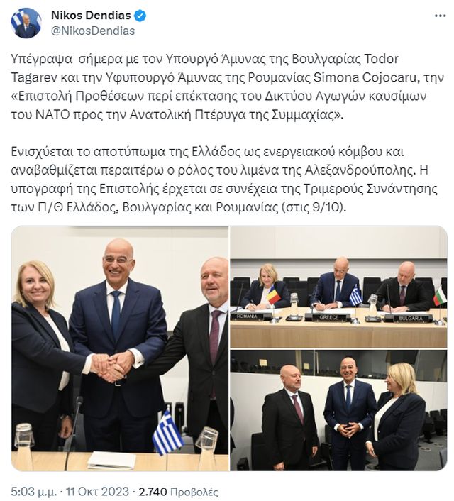 «Η υπογραφή της Επιστολής έρχεται σε συνέχεια της Τριμερούς Συνάντησης των πρωθυπουργών Ελλάδος, Βουλγαρίας και Ρουμανίας (στις 9/10)» καταλήγει η ανάρτηση του κ. Δένδια.