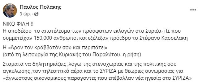 «Σταμάτα να δηλητηριάζεις λόγω της στενοχώριας και της πολιτικής σου αγκύλωσης τον τηλεοπτικό αέρα και το ΣΥΡΙΖΑ» έγραψε ο Π. Πολάκης στον προσωπικό του λογαριασμό στο facebook.