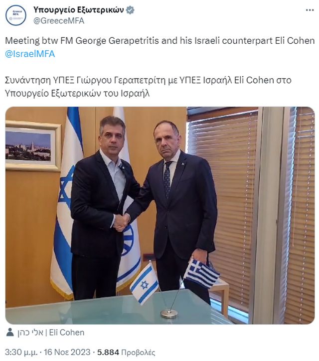 Με τον Ισραηλινό ομόλογό του Έλι Κοέν συναντήθηκε στο υπουργείο Εξωτερικών του Ισραήλ, ο υπουργός Εξωτερικών Γιώργος Γεραπετρίτης.
