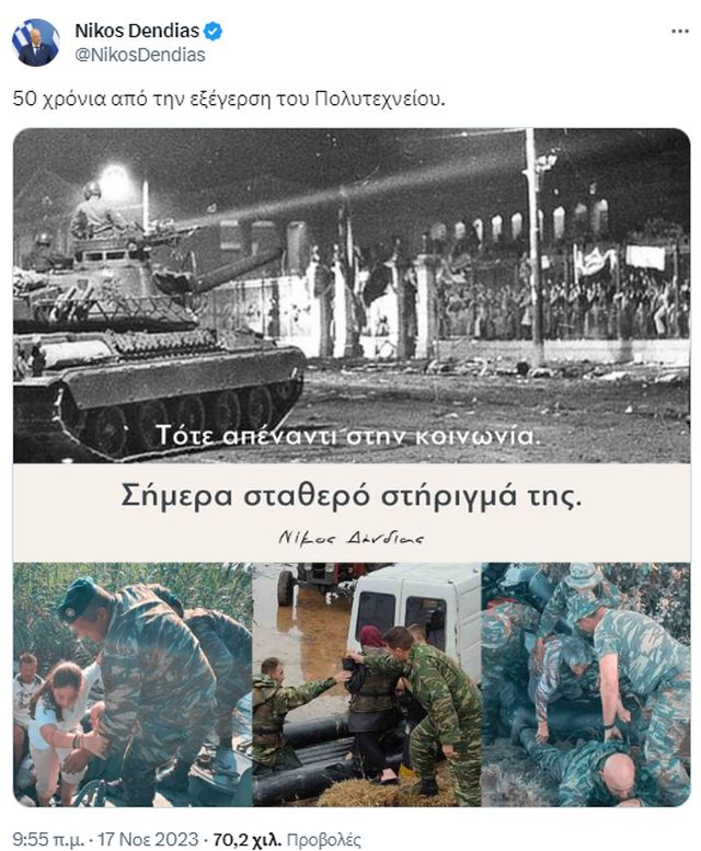 Ο υπουργός Εθνικής Άμυνας κάτω από την επετειακή του λεζάντα «50 χρόνια από την εξέγερση του Πολυτεχνείου» δημοσίευσε τη γνωστή εικόνα του τανκ να μπαίνει στο Πολυτεχνείο. Πάνω σε αυτή διαβάζουμε «Τότε [σ.σ. ο στρατός] απέναντι στην Κοινωνία». Σε δεύτερη συνοδευτική εικόνα, στην ίδια ανάρτηση, με σύγχρονους Έλληνες στρατιώτες να συνδράμουν Έλληνες πολίτες σε φυσικές καταστροφές κι άλλες ανάγκες, γράφει «Σήμερα [σ.σ. ο στρατός] σταθερό στήριγμά της».
