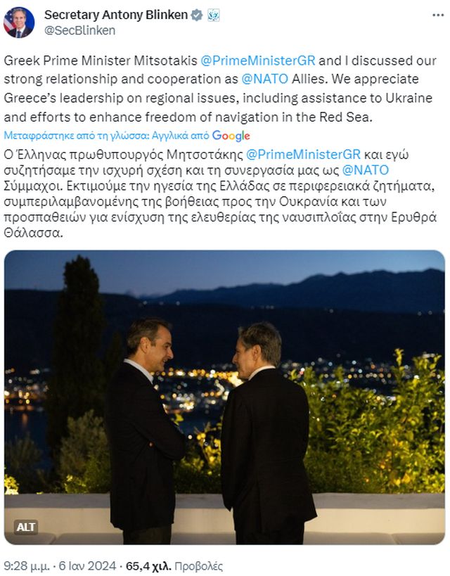 »Εκτιμούμε τον ηγετικό ρόλο της Ελλάδας σε περιφερειακά ζητήματα, συμπεριλαμβανομένης της βοήθειας προς την Ουκρανία και των προσπαθειών για την ενίσχυση της ελευθερίας της ναυσιπλοΐας στην Ερυθρά Θάλασσα» έγραψε ο Αμερικανός υπουργός Εξωτερικών.