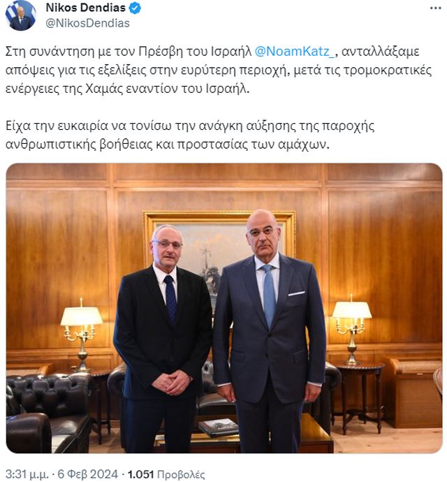 «Στη συνάντηση με τον Πρέσβη του Ισραήλ Νόαμ Κατς, ανταλλάξαμε απόψεις για τις εξελίξεις στην ευρύτερη περιοχή, μετά τις τρομοκρατικές ενέργειες της Χαμάς εναντίον του Ισραήλ.
