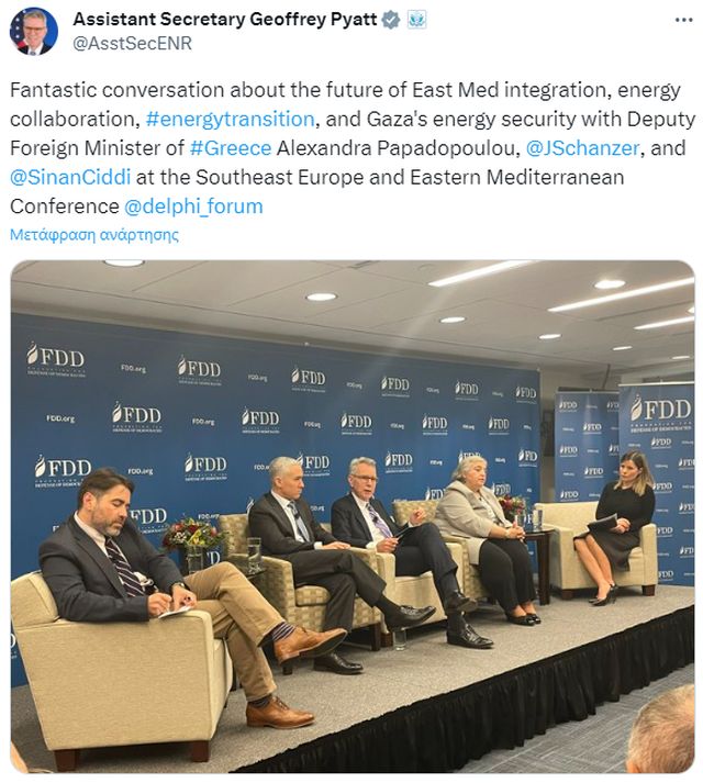 Αυτό ανέφερε μεταξύ άλλων ο assistant secretary του υπουργείου Εξωτερικών των ΗΠΑ, Τζέφρι Πάιατ, σε συζήτηση σχετικά με το μέλλον της ολοκλήρωσης της Ανατολικής Μεσογείου, την ενεργειακή συνεργασία και την ενεργειακή μετάβαση, αλλά και τις προκλήσεις για την αρχιτεκτονική ασφαλείας της περιοχής, που πραγματοποιήθηκε στο think tank Foundation for Defense of Democracies FDD.