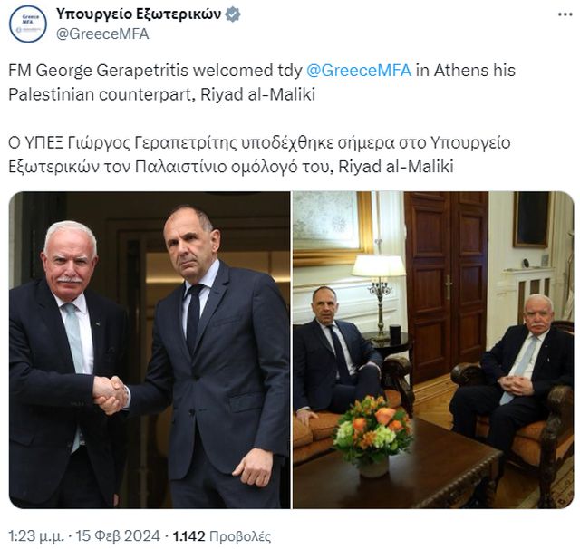 Ολοκληρώθηκε η συνάντηση του υπουργού Εξωτερικών, Γιώργου Γεραπετρίτη, με τον Παλαιστίνιο ομόλογό του, Ριάντ Αλ-Μαλίκι, που πραγματοποιήθηκε στην Αθήνα.