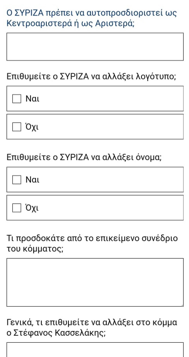 Στο ερωτηματολόγιο τίθεται το ερώτημα «αν πρέπει να αυτοπροσδιοριστεί ως Αριστερά ή Κεντροαριστερά», όπως και αν πρέπει να αλλάξει ο ΣΥΡΙΖΑ ΠΣ όνομα και λογότυπο.