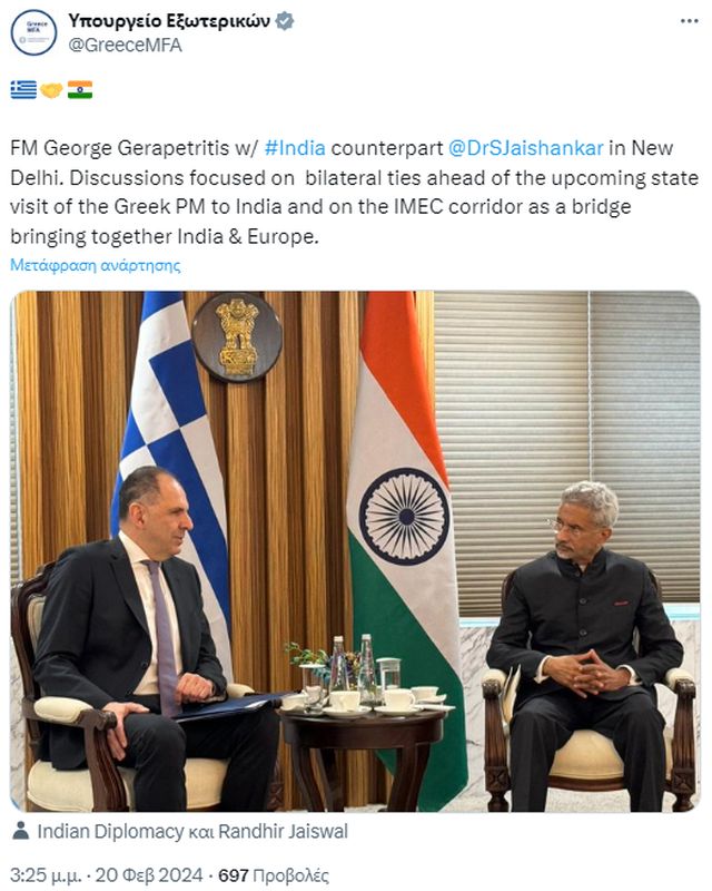 »Σε μια εποχή γεωπολιτικών μεταβολών, ο ρόλος της εταιρικής σχέσης Ινδίας-ΕΕ είναι καθοριστικός για την προώθηση της σταθερότητας και της ευημερίας», πρόσθεσε ο υπουργός Εξωτερικών.