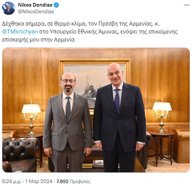 «Δέχθηκα σήμερα, σε θερμό κλίμα, τον Πρέσβη της Αρμενίας. κ. @TMkrtchyan στο Υπουργείο Εθνικής Άμυνας, ενόψει της επικείμενης επίσκεψής μου στην Αρμενία», έγραψε ο Νίκος Δένδιας.