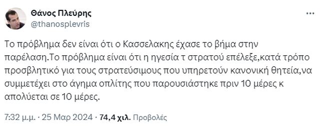»Το πρόβλημα είναι ότι η ηγεσία του στρατού επέλεξε, κατά τρόπο προσβλητικό για τους στρατεύσιμους που υπηρετούν κανονική θητεία, να συμμετέχει στο άγημα οπλίτης που παρουσιάστηκε πριν 10 μέρες και απολύεται σε 10 μέρες» έγραψε ο Θάνος Πλεύρης.