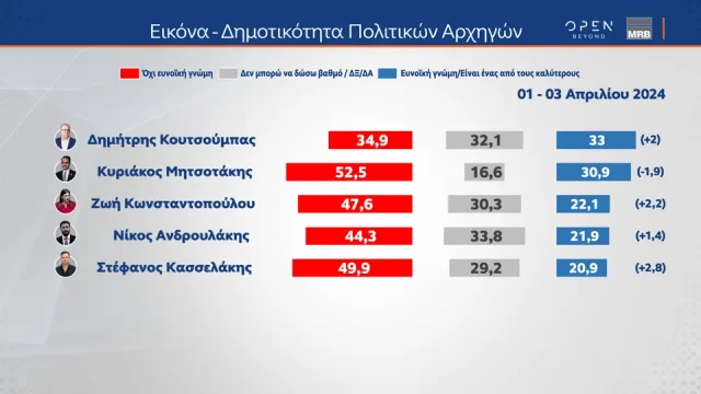 Στη δημοτικότητα των πολιτικών αρχηγών ο Κυριάκος Μητσοτάκης έχασε την πρώτη θέση στην δημοτικότητα και βλέπει την «πλάτη» του γγ του ΚΚΕ Δημήτρη Κουτσούμπα.