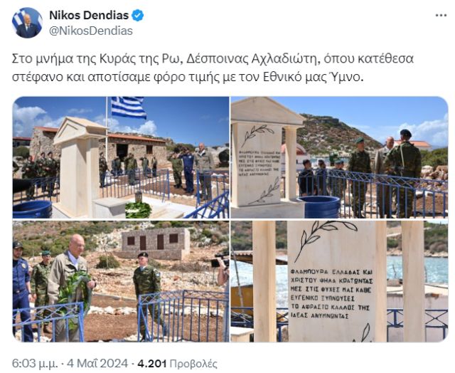 Κατά την επίσκεψή του, ο υπουργός Εθνικής Άμυνας κατέθεσε στεφάνι στο μνημείο της «Κυράς της Ρω», Δέσποινας Αχλαδιώτη.