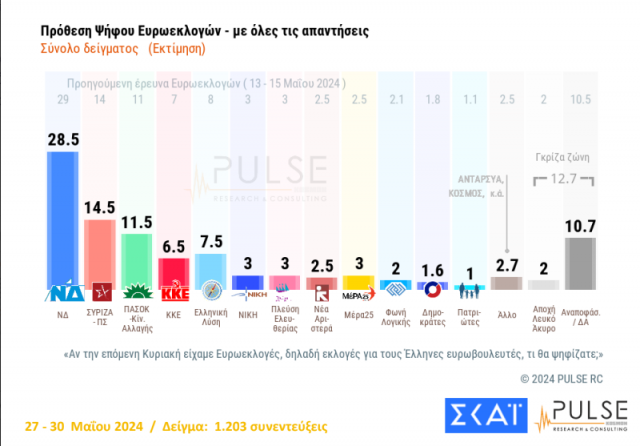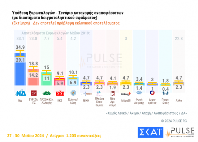 Σταθερά κάτω του 30% παραμένουν τα ποσοστά της Νέας Δημοκρατίας για τις ευρωεκλογές σύμφωνα με τη δημοσκόπηση της PULSE για τον ΣΚΑΪ, 10 ημέρες πριν τη διεξαγωγή των ευρωεκλογών, την Κυριακή, 9 Ιουνίου.