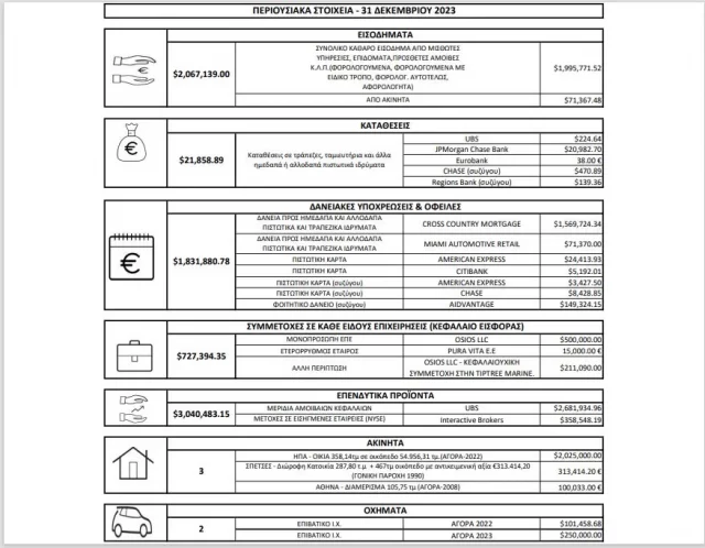 Παρουσίασε συγκριτικό πίνακα με τα περιουσιακά στοιχεία του κ. Μητσοτάκη το 2021 (δείτε τη φωτογραφία κατωτέρω) και κατηγόρησε τον πρωθυπουργό ότι έχει εξαπολύσει επίθεση εναντίον του για το θέμα του «πόθεν έσχες», ενώ η ηλεκτρονική πλατφόρμα για την υποβολή του παραμένει κλειστή.