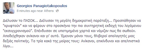 Επίθεση μέσω facebook εξαπέλυσε ο επικεφαλής της Αριστερής Πρωτοβουλίας και πρώην στέλεχος του ΠΑΣΟΚ, Γιώργος Παναγιωτακόπουλος, στις μνημονιακές ηγεσίες του ΠΑΣΟΚ.