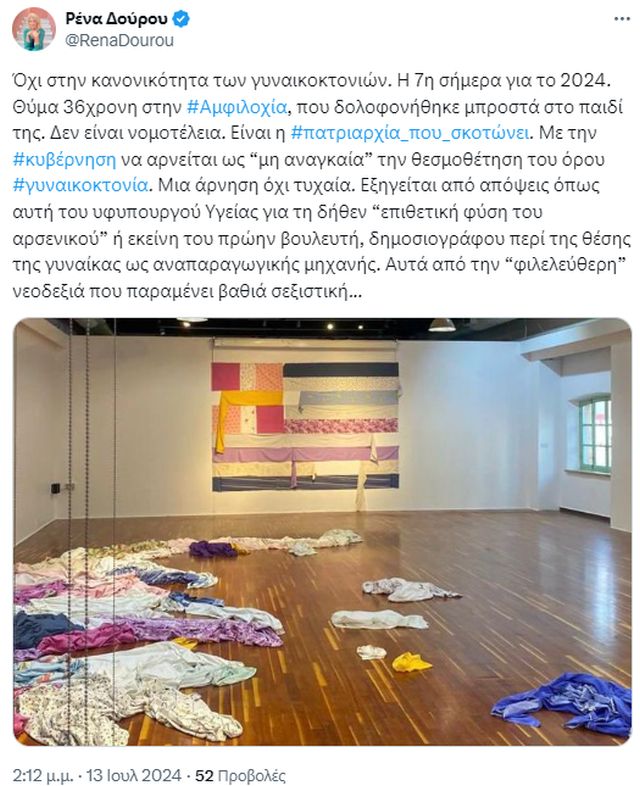 Η βουλευτής του ΣΥΡΙΖΑ Προοδευτική Συμμαχίαμ επισημαίνει ότι είναι η πατριαρχία που σκοτώνει και καταγγέλλει ως υπεύθυνη την «“φιλελεύθερη” νεοδεξιά που παραμένει βαθιά σεξιστική».