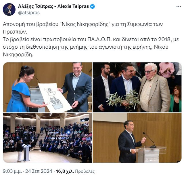 «Την ανάγκη να διατηρηθεί η δυναμική που δημιουργήθηκε για την ευρωπαϊκή προοπτική της περιοχής από την Συμφωνία των Πρεσπών», υπογράμμισε ο πρώην πρωθυπουργός και πρόεδρος του ΣΥΡΙΖΑ, Αλέξης Τσίπρας κατά την τελετή βράβευσης του, με το βραβείο Ειρήνης του Παρατηρητηρίου Διεθνών Οργανισμών και Παγκοσμιοποίησης, ενώ αναφερόμενος στην διεθνή θέση της χώρας μας σημείωσε ότι «είναι πιο απαραίτητο από ποτέ η Ελλάδα να επανέλθει σε μια εξωτερική πολιτική που εδραιώνει την θέση της ως κύριο πυλώνα ειρήνης και σταθερότητας στην περιοχή, αντί να διεκδικεί τον επικίνδυνο ρόλο του προκεχωρημένου φυλακίου της Δύσης».