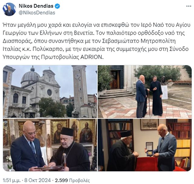 Ο Νίκος Δένδιας, με την ευκαιρία της συμμετοχής του στη Σύνοδο Υπουργών της ADRION στη Βενετία, επισκέφθηκε και το «ελληνικό οχυρό» στη Γαληνοτάτη, δηλαδή το Ελληνικό Ινστιτούτο Βενετίας, διάδοχη δομή της Ελληνικής Αδελφότητας Βενετίας και τον στρατιωτικό ναό, δηλαδή ναό Ελλήνων ιπποτών της Αναγέννησης, τον περιώνυμο Άγιο Γεώργιο των Ελλήνων, που αποτελεί ιδιοκτησία της Ελληνικής Δημοκρατίας κι όχι της Εκκλησίας.